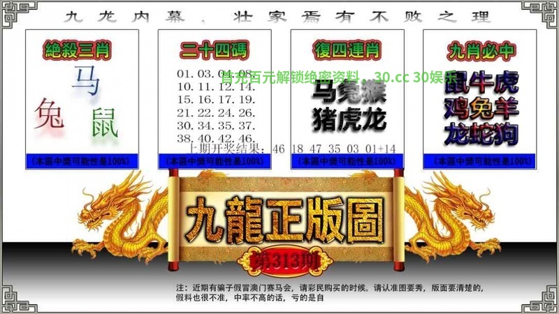 | 313期:九肖 | 龙虎兔蛇牛羊鼠马猪 | 开:龙38中 |